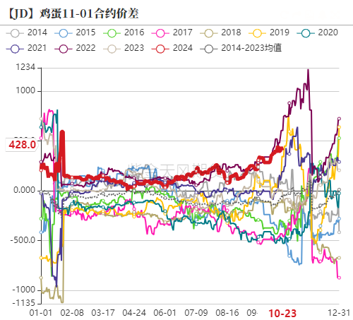 国庆节后鸡蛋现货价格持续上涨,因市场预期11月蔬菜价格回调影响需求以及供给端增量呈现增加趋势,因此2411合约基差反弹走高,截止到10月23日,2411合约的基差为779,属于历史同期高位。国庆节后2501合约基差也呈现逐步上涨的趋势,与2022年水平相当,主要是因市场预期四季度供需逐步宽松,对远期合约较为悲观,因此2501合约贴水幅度较大,但也反映了远期合约的利空因素已经兑现。