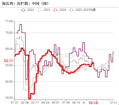 据Mysteel农产品数据统计,截止到10月18日当周,淘汰鸡出栏量52.11万只,周度环比增加2%;上周平均淘汰日龄525天,与前一周增加3天。国庆节后现货价格超预期反弹,市场惜淘情绪较强,因此节日后淘鸡节奏不及预期,淘鸡日龄持续增加。从鸡苗补栏周期推算,10月可淘老鸡数量较多,若淘鸡节奏不能保持高水平,后期供应压力将会增加。